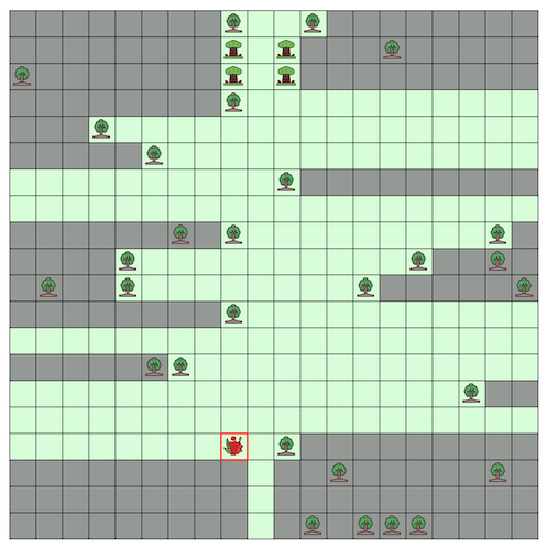 - 気持ちとしては、「できるだけ冒険者の確認済みマスが増えないほうが嬉しい」ので、冒険者の動きに合わせて、できるだけ確認済みマスが増えないように木を配置する、ことが考えられる