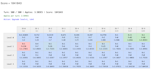 - ある(i,j)をチェックポイントとして、そこを強化するまでは「チェックポイントを取るまでに必要なターン数をできるだけ少なくする」、チェックポイントを強化したら「そのiのみに集中してできるだけ最終的なりんご数を多くする」のを目指す